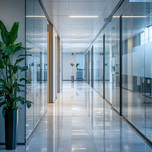 Generate an image of the hallway in a modern company office. The hallway should be spacious, with clean and glossy tiles or carpet covering the floor. On both sides, there are glass-walled meeting rooms or office doors, with the glass featuring the company's logo or design. Bright lighting from the ceiling illuminates the space, and the walls are adorned with simple, modern decorations. The overall atmosphere should convey a professional and sophisticated business environment.