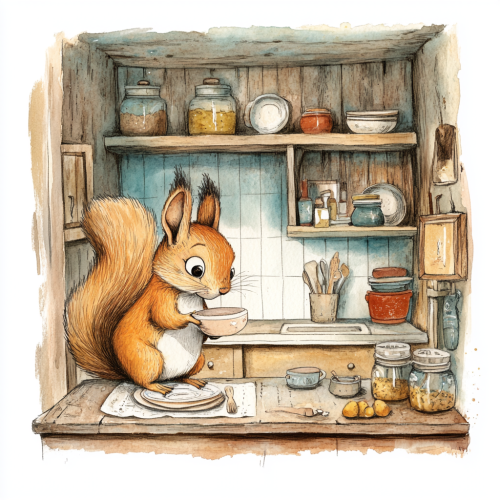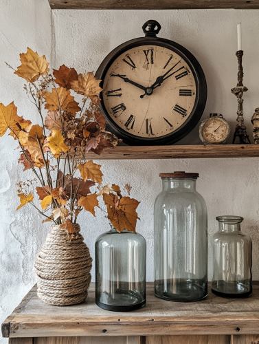 On the shelf in my kitchen, there is an old clock with wooden branches and leaves and autumn-colored flowers, glass vases with rope around them, simple decorations, natural elements, and cozy fall vibes. --ar 3:4 --style raw