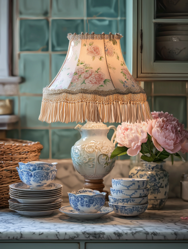 A super realistic old English kitchen setting featuring a A beautiful antique lamp with tassels and a floral-printed shade sits off center and casts a warm light on the room, illuminating the antique porcelain plates and stacked pastel dishes on the marble countertop. Blue and white bowls add a touch of elegance, with pink peonies in a vase nearby. The atmosphere is cozy, surrounded by woven wicker baskets and a background of distressed blue-green tiles and aged wood. Natural lighting.The lamp and floral lampshade is high texture detail, extreme photographic realism and the centerpiece of the scene hyper realistic photography, sharp clear focus low stylization --ar 3:4 --quality 2 --v 6.1