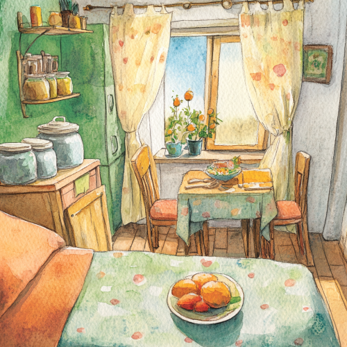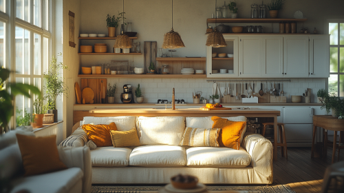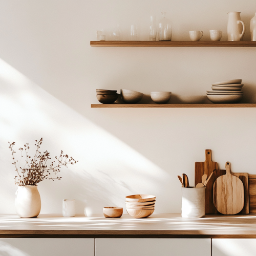 Create a cozy kitchen scene where 80% of the image focuses on a large, smooth white wall that serves as the primary element. The wall should be perfectly smooth and evenly lit with warm, natural light to create a clean and inviting space for wallpaper. In the background, at the extreme edge of the frame, include a blurred, warm-toned wooden shelf with a few simple kitchen items, like a small stack of bowls or a hanging towel. A hint of a soft kitchen rug can be visible to suggest warmth without taking attention away from the wall.