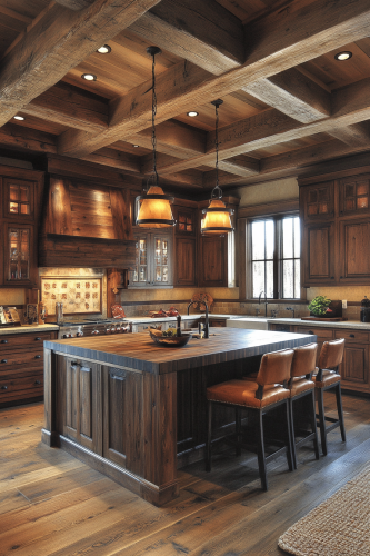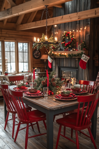 Photograph a kitchen that showcases a rustic cabin Christmas aesthetic, with natural wood finishes, warm plaid accents, and a cozy fireplace. Include a farmhouse table set for a holiday meal, adorned with pine cone centerpieces and classic red candles. The kitchen should be shot in warm lighting to highlight the rich textures and inviting atmosphere. This setting should be so inviting and well-organized that it draws viewers into a rustic holiday experience. Neat and organized. Camera: DSLR - Canon EOS 5D Mark IV. Lens: Canon EF 24-70mm f/2.8L II USM. Composition: Wide shot, room-centered, horizontal orientation, balance between furniture and space. Film: Digital, high resolution, color profile sRGB. Camera settings: ISO 400, f/2.8, 1/60 sec. --ar 2:3 --v 6.1 --s 250