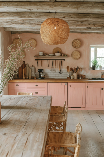 Photograph a kitchen with Coral Charm pink kitchen cabinets, showcasing a warm, inviting coral hue. Complement these cabinets with light wooden countertops and a creamy ceramic tile backsplash for a cozy, natural feel. Add a rustic farmhouse table and rattan chairs to enhance the casual, charming atmosphere. The flooring should be a light bamboo, contributing to the airy, open feel of the space. This kitchen should appear as a welcoming heart of the home, ideal for family gatherings. Neat and organized. Camera: DSLR - Canon EOS 5D Mark IV. Lens: Canon EF 24-70mm f/2.8L II USM. Composition: Wide shot, room-centered, horizontal orientation, balance between furniture and space. Film: Digital, high resolution, color profile sRGB. Camera settings: ISO 400, f/2.8, 1/60 sec. --ar 2:3 --v 6.1 --s 250