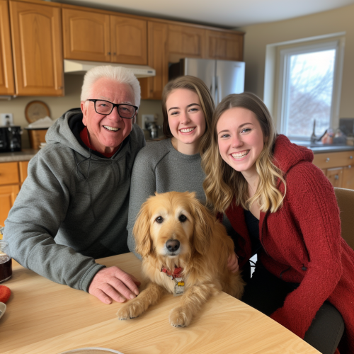 an image shows three figures in a cozy kitchen setting. On the left is a young woman with long, wavy blonde hair, wearing a loose brown jacket and jeans. She is smiling warmly at the camera. In the middle is an older man with white hair and glasses, wearing a green fleece jacket, smiling affectionately. In front of them, a golden retriever with a fluffy coat is standing on its hind legs, looking directly at the camera with a happy expression and its tongue out. The kitchen has wooden cabinets and various items on the countertop and shelves, giving a warm, homey atmosphere. --style raw --v 5.2
