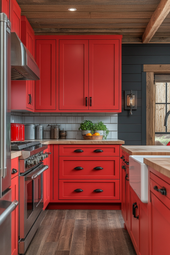 Show a kitchen with Tomato Tango red kitchen cabinets, which have a rich tomato red color that adds a rustic yet vibrant touch. Pair these cabinets with a butcher block countertop and a classic white subway tile backsplash for a timeless look. Dark slate flooring can enhance the rustic feel. Include a cozy dining area with a wooden table and chairs to create a homey atmosphere. This kitchen should be warm and inviting, perfect for casual family meals and gatherings. Neat and organized. Camera: DSLR - Canon EOS 5D Mark IV. Lens: Canon EF 24-70mm f/2.8L II USM. Composition: Wide shot, room-centered, horizontal orientation, balance between furniture and space. Film: Digital, high resolution, color profile sRGB. Camera settings: ISO 400, f/2.8, 1/60 sec. --ar 2:3 --v 6.1 --s 250