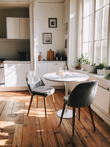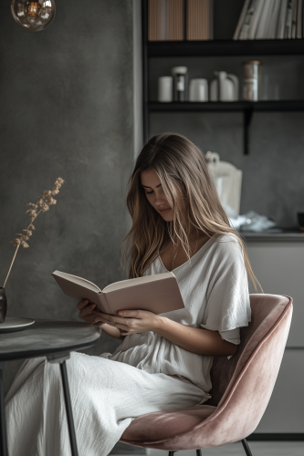 Create An eye-catching scene of woman sitting in the kitchen and reading a book sitting on a velvet dinning chair, a top sensitive design, grey wall, dirty pink dinning chairs, modern cozzy interior, The background Sony A7S III and a 35mm f/2 ASPH lens. --ar 2:3