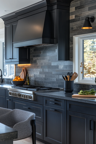 Show a kitchen with Coal Comfort dark kitchen cabinets in a charcoal finish, offering a soft yet powerful presence. These cabinets should be complemented by a glossy gray quartz countertop and a backsplash of slate tiles. Matte black fixtures and minimalist Scandinavian furniture should keep the space modern and functional. Soft woolen throws and cushions on a window seat can add a layer of comfort. This kitchen should be a stylish and cozy space, perfect for modern families. Neat and organized. Camera: DSLR - Canon EOS 5D Mark IV. Lens: Canon EF 24-70mm f/2.8L II USM. Composition: Wide shot, room-centered, horizontal orientation, balance between furniture and space. Film: Digital, high resolution, color profile sRGB. Camera settings: ISO 400, f/2.8, 1/60 sec. --ar 2:3 --v 6.1 --s 250