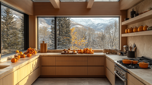 detailed interior shot, home decor details of cozy mid century kitchen of Luxury Aspen home designed by Athena Calderone, kitchen decoration and kitchen accessories --ar 16:9 --v 6.1 --s 750