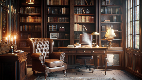 A refined English study room with space fragrance accents dark wooden bookshelves filled with leather-bound books, a vintage leather armchair near a polished mahogany desk, elegant fragrance diffusers and candles placed around the room, emitting soft trails of aromatic mist with scents of sandalwood, cedar, and lavender, antique lamps casting a warm, golden light, creating an atmosphere of calm and sophistication, subtle hints of vanilla and bergamot enhancing the ambiance, all captured in a classic, warm color palette with rich textures and high detail --ar 16:9 --q 2 --v 6.1