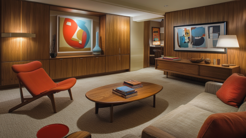 A mid-century modern living room with mid-century furniture and art, walnut built-in cabinets, a wood coffee table, a carpeted floor, warm lighting, a soft color palette of red, orange, blue, green, brown, and white. --ar 16:9 --v 6.1