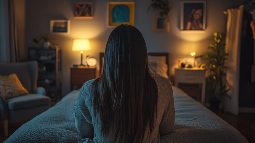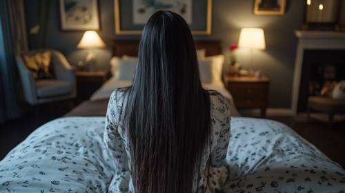 A hyper-realistic shot taken with a Sony Alpha 7 III - Full-frame Interchangeable Lens Camera & Lens Kit 24.2MP, 10FPS, 4K/30p. The image captures a Hispanic woman with long, straight dark hair, sitting up in her bed, facing away from the camera. The point of view is from where the headboard would be, but the bed itself is not visible in the frame. Instead, the focus is on the rest of the room, showcasing elegant furniture, artwork on the walls, ambient lighting from bedside lamps, and other decor elements. The room exudes a cozy, intimate atmosphere with warm lighting and carefully arranged furnishings, such as a comfortable armchair, a small table with decor items, and plants. The overall composition emphasizes the beauty and serenity of the space, without the bed dominating the foreground. --v 6.1 --ar 16:9