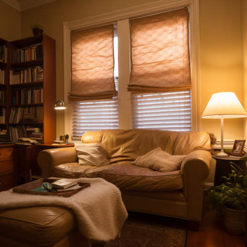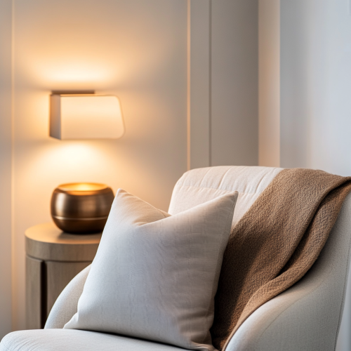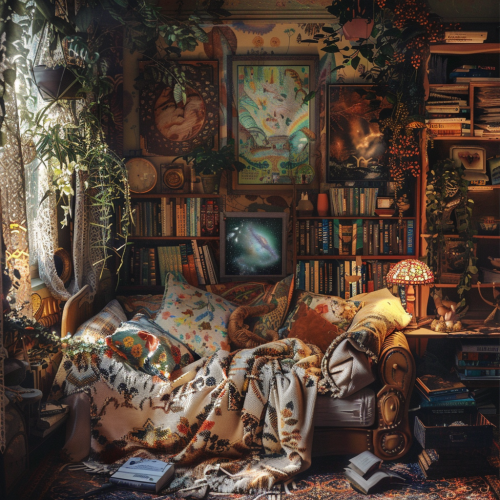 image of cozy, relaxed enviromnent, portraiting lifestyle in space, soft light, warm tone, intricate design, vivid color --ar 1:1 --v 6.0