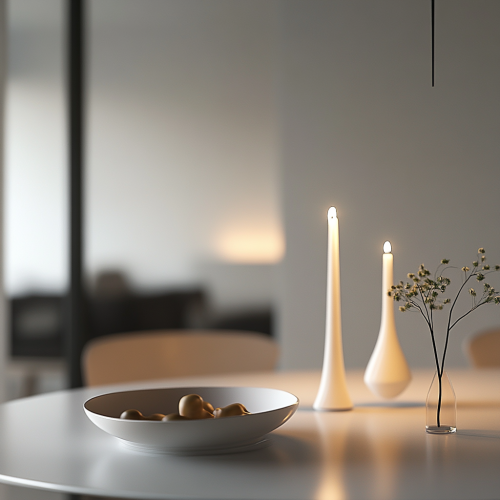 Create a cozy, minimalist dining room setting where 80% of the image is filled with a close-up of a smooth, white wall. The wall should be the primary focus, perfectly clean and softly lit with warm, diffused lighting. At the far edge of the frame, add a very blurred hint of a simple candle holder or a sleek dining chair back in a muted, warm color, providing a cozy touch without detracting from the wall’s emphasis.
