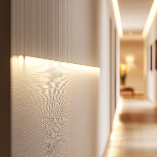 Create a cozy hallway scene where 80% of the image is a close-up of a smooth, white wall that dominates the frame. The wall should be flawlessly clean and lit with warm, soft lighting to enhance its textureless surface. At the far side of the frame, add a very subtle, blurred edge of a simple, small picture frame or a narrow console table, providing a hint of decor without detracting from the wall’s importance.