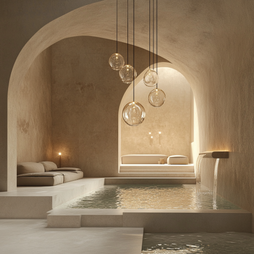 design a luxury and modern therme. natural color, small pool with seating above, soft light, chandelier with glass ball handing fro the ceiling, design minimal, soft and calm atmosphere