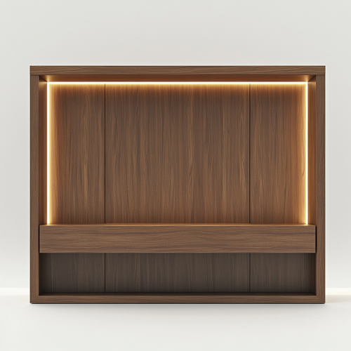 a front elevation of an 8'x8' wall section on a white background. The wall is designed by Rolex, with built in soft white lighting and finished in light walnut wood. The design is modern, immaculate, and sleek.