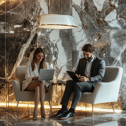 A sleek, minimalist scene with stylish young people using a high-end device like a laptop or smartphone, or talking and laughing. They're seated in a luxurious, modern environment with polished marble, glass, and metal surfaces. Soft, elegant lighting enhances the premium feel of the setting. The person appears confident and relaxed, embodying freedom and ease while interacting with the latest tech. Emphasize clean, sophisticated design and high-end materials. the color tone is grey and a touch of lime green