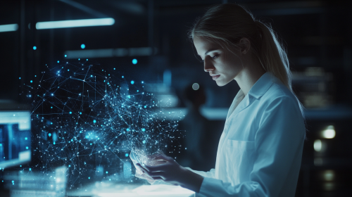 Create a hyperrealistic image depicting 'Unraveling the Magic of Transfer Learning in AI.' The scene should feature a modern technological environment where AI models are applying transfer learning to solve complex problems across different domains. Show neural networks, data flows, and AI systems transferring knowledge from one task to another. Include diverse professionals working with these models in labs or high-tech offices. The lighting is cinematic with practical light and diffused backlight, creating a bright, innovative atmosphere. Use a 55mm lens with depth of field, f/2.8 aperture for exquisite detail and sharp focus. Incorporate production-quality elements, realistic lens flare, and award-winning photography standards. Utilize Unreal Engine for realistic lighting, shadows, and reflections. Emphasize intricate details with a touch of CGI and VFX for a futuristic look. Ensure the overall image has a bright, innovative tone with realistic optics and tone mapping, adhering to professional cinema photography standards. --ar 16:9