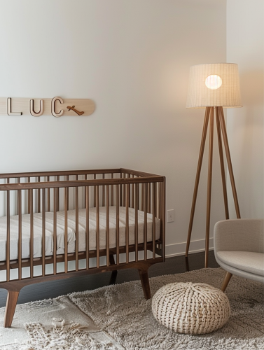 an 15 feet of length wall dedicated for a baby. white wall, walnut wood crib whit a name LUCA on the wall. Cozy floor lamp on the rigth. three wall shlef holdiing books --v 6.0 --ar 3:4