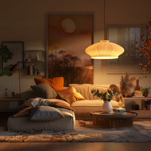 image of cozy, relaxed enviromnent, spacious, modern, high-tech, soft light, warm tone, intricate design, vivid color --ar 1:1 --v 6.0