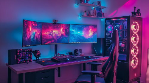 image of a modern and stylish gaming setup. The scene should feature a desk with three monitors mounted on a stand, displaying vibrant and dynamic graphics. The space should be illuminated with RGB lighting that enhances the futuristic and tech-savvy aesthetic. Include a powerful gaming PC with a transparent case and illuminated components positioned next to the monitors. The ergonomic chair should be comfortable and sleek, with design elements that match the gaming theme. Add an elegant soundbar in front of the setup for immersive audio. Ensure that all elements are well-integrated and harmonious, creating a high-performance and engaging gaming environment --ar 16:9