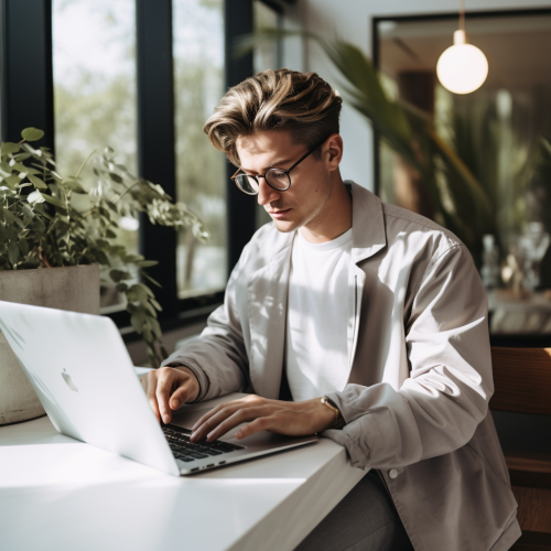natural looking no filter male blog content writer working at a modern slimline laptop in a soft light grey colour modern clothes and agency setting, editorial style photo