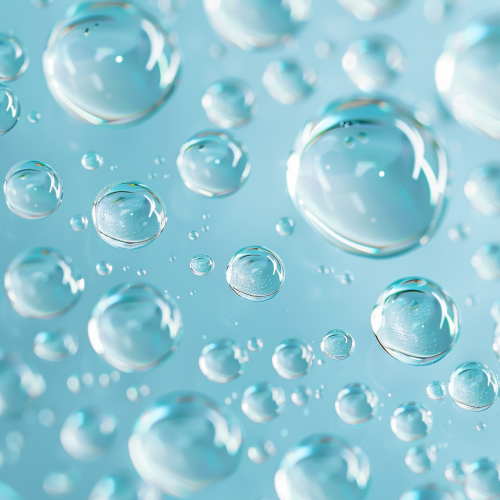A close-up of multiple water droplets against a delicate light blue background, arranged in a pleasing pattern. Each droplet is highly detailed with visible reflections and highlights. The background is a soft, blurred light blue, creating a calm and refined effect. Soft lighting enhances the droplets’ clarity and sparkle. Created Using: Photorealistic, detailed droplets, blurred background, soft light, hd quality --v 6.0