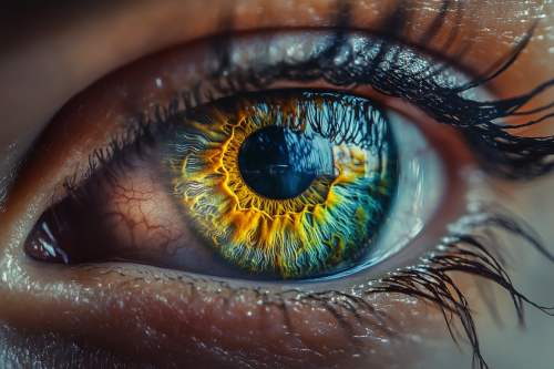 Create a hyper-realistic close-up shot of a human eye, capturing intricate details of the iris, with a striking combination of yellow, green, and blue hues. The eye is framed by the natural textures of the surrounding skin, including fine hairs and subtle skin lines, with soft lighting that enhances the depth of the iris and reflects softly off the surface. The focus is sharp on the iris, highlighting the unique patterns and colors, while the rest of the surrounding skin and features fade slightly out of focus for an artistic yet lifelike portrayal. --ar 3:2 --v 6.1