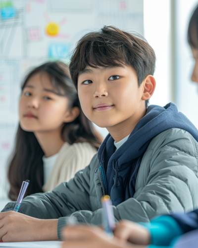 A realistic close-up photo of two Korean middle school students, a boy and a girl, sitting side by side, focused on their English studies. The boy, smiling confidently, looks straight ahead, while the girl slightly lowers her head as she writes. Both are holding pens, with a minimalistic white wallpaper background. Bright natural light, shallow depth of field --ar 4:5 --v 6.0