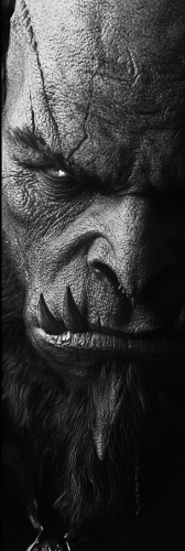 Close-up portrait of an orc in black and white, with a focus on high detail and texture. The orc's skin features rough, intricate details, with more white tones than black, giving a brighter overall appearance. The lighting should be soft and even, minimizing deep shadows while still providing some subtle shading to emphasize contours and facial features. The background is black to contrast the orc's lighter tones, but the overall feel should be more balanced and less dramatic, focusing on clarity and detail rather than harsh contrast. --ar 1:3