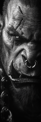 Close-up portrait of an orc in black and white, inspired by the iconic orcs of Warcraft. The focus is on high detail and texture, with rough, intricate skin features. The orc has rings on its tusks and several scars across its face, adding character and history. The orc’s skin features more white tones than black, giving a brighter overall appearance. The lighting is soft and even, minimizing deep shadows, especially around the eyes, which should remain visible and not too dark. The background is black to contrast the orc's lighter tones, while the overall feel remains balanced, focusing on clarity and detailed facial features. --ar 1:3