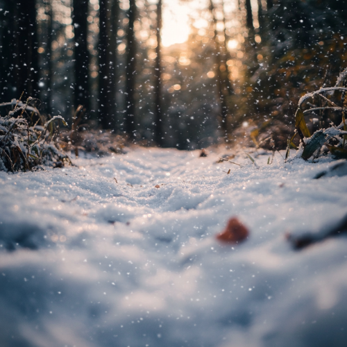 Close up Fluffy snow covered path in Central Oregon Forest. Low angle. Background blurred. It is snowing. Pre-dawn,slightly warm light. Highly Detailed, --ar 1:1 --v 6.1