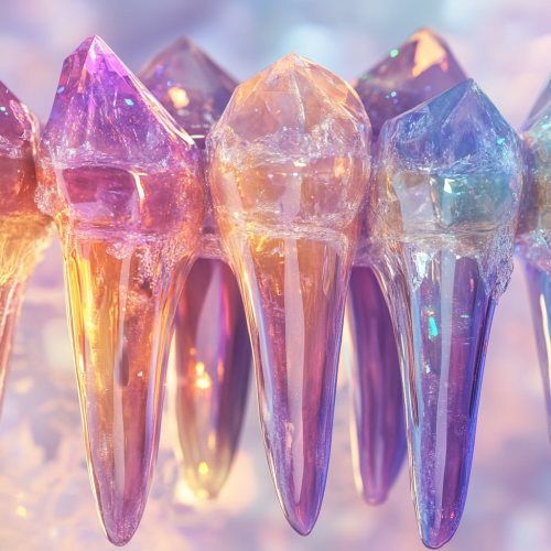 A close-up of a set of human teeth, but each tooth is uniquely crafted from different types of crystals, such as amethyst, quartz, and sapphire. The teeth sparkle with vibrant colors and reflect light like precious gemstones. The background is a soft, blurred gradient to emphasize the crystalline texture and intricate details of the teeth. The overall image should have a mystical and surreal quality, blending realism with fantasy."