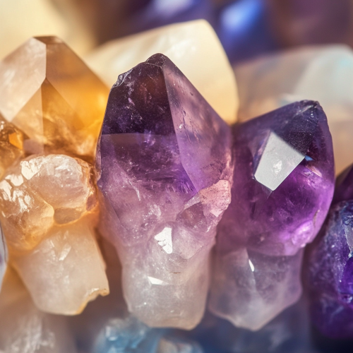set of human teeth, but each tooth is uniquely crafted from different types of crystals, such as amethyst, quartz, and sapphire. The teeth sparkle with vibrant colors and reflect light like precious gemstones. The background is a soft, blurred gradient to emphasize the crystalline texture and intricate details of the teeth. The overall image should have a mystical and surreal quality, blending realism with fantasy."
