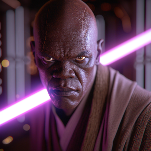 A 3D rendered visualization of a very close up shot of Mace Windu. Detailed, light and dark elements, dynamic, cinematic::3 --v 6.0