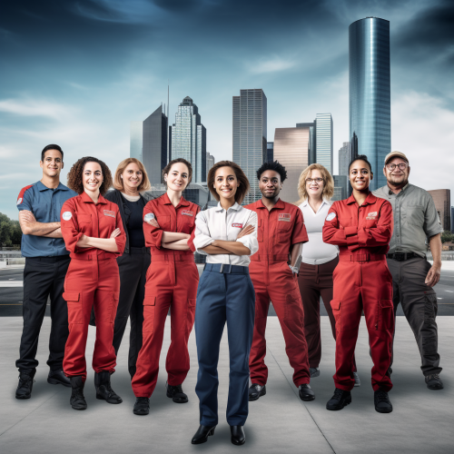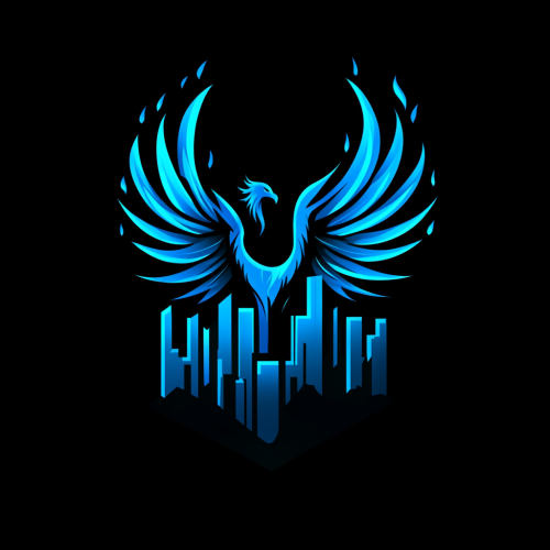 Design a striking logo featuring the Houston skyline with a blue, fiery phoenix soaring upward, symbolizing renewal and resilience. The phoenix should be surrounded by bright blue flames, creating a strong contrast against a black background. The design should evoke power and energy, with the phoenix's wings and flames extending upwards, creating a sense of movement and dynamic transformation.