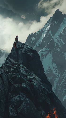 A humanoid phoenix in battle armour wielding fire on top of a mountain. Digital art.