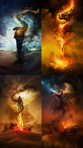 cinematic, portrait photography, An epic triptych showcasing the iconic fire attribute monsters of fantasy. The first panel reveals the Ifrit, a towering figure surrounded by desert winds and flames, embodying its power and malevolence. The second panel captures the Salamander, nestled in a bed of fire, its small, lizard-like form glowing with an inner flame, symbolizing transformation and control over fire. The final panel illustrates the magnificent Phoenix in the moment of rebirth, radiant feathers illuminating the scene as it rises from its ashes, a testament to regeneration and immortality. Each creature is set against a backdrop that reflects its unique environment and lore, highlighting the significant roles they play in the fantasy world --ar 9:16 --s 0 --v 6.0 --style raw