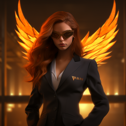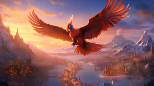 A fire goddess, soaring through the sky dressed like a phoenix, spreading her wings across destructive volcanos and setting the sky on fire.