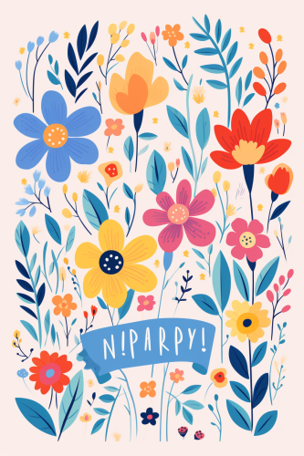 the words HAPPY BIRTHDAY in the center with flowers centered around it, minimalist childlike digital floral pattern, vibrant rainbow colors, hand painted digital flowers inspired by Mary Blair, flat vector illustration, --ar 2:3