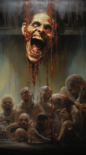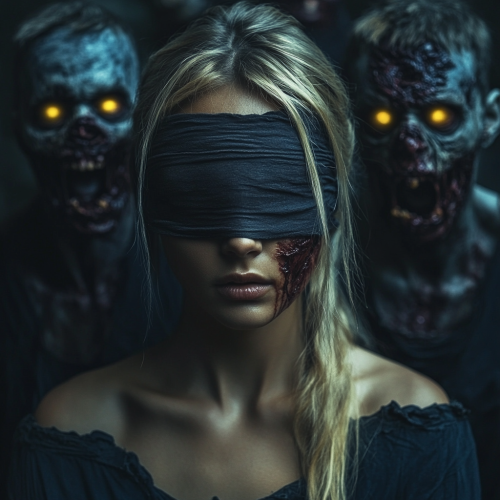 dark night sky background, close up of extremely beautiful blonde woman blindfolded, behind her zombies blueish rotting skin yellow eyes about to attack her surreal --style raw --v 6.1 --s 250