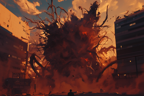 a large explosion of dirt and concrete in a dark town during a thunderstorm + horror + art style of Capullo, Brom, Whelan, aly fell rutkowski, art germ, rossdraws, and franzzeta + art station + ultra detailed + hyper realistic + 8k --ar 3:2 --niji 6