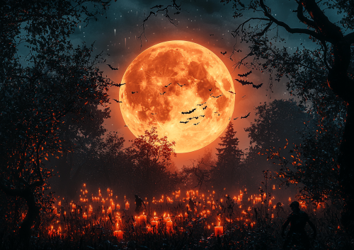 An oil painting of two indigenous Mexican woman in the foreground, they are sitting on a grave on the traditional night of the dead and wearing catrina makeup. It is nighttime but the light from the candles is enough to illuminate the bougainvillea hanging in the corner. In the background you can see the cemetery filled with candle lights + mexican art style + oil painting + --ar 16:9