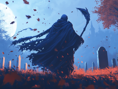 A death-reaper. Scary. Dark. Ominous. Swinging a scythe wildly at the observer. Wearing a dark cloak with dark blue trims. Ice and frost in the reaper's path. The surroundings are fields in fall. Leaves are falling. Night time. Full moon. Cemetary. Dynamic dutch angle. Fantasy RPG setting, wide angle. Detailed. --ar 4:3 --v 6.1