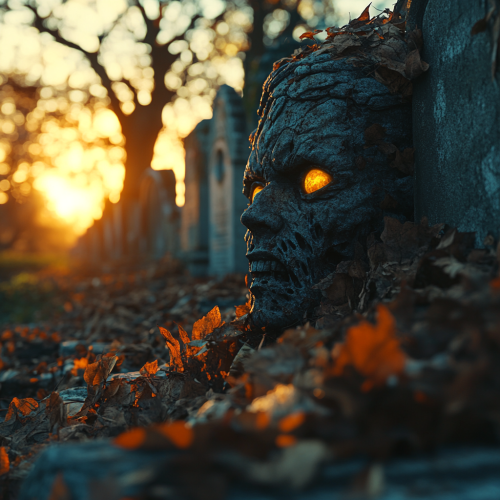sundown background ,old tombstones, pile of leaves in an old cemetery burying zombies blueish skin yellow eyes up to their eyes, surreal --style raw --v 6.1 --s 250