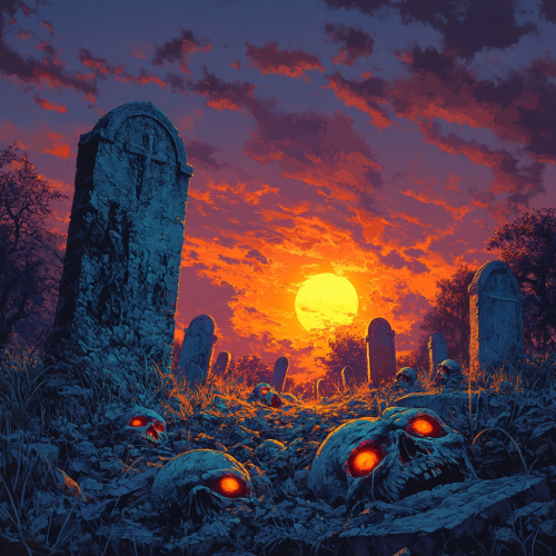 sundown background ,old tombstones, pile of leaves in an old cemetery burying angry screaming zombies blueish skin orange eyes up to their eyes, surreal Gustave Dore style in color --v 6.1 --s 250