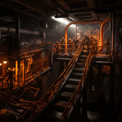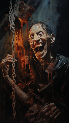 A spooky zombie carpenter in a dimly lit workshop, carving aa window from wood. Cobwebs hang from the rafters, and jack-o'-lanterns flicker in the corners, casting eerie shadows