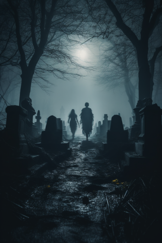 2 creepy horrible ghosts walking forward in a cemetery at night, moody atmosphere, cinematic scene, super detailed, 8k resolution, --v 5.2 --ar 2:3
