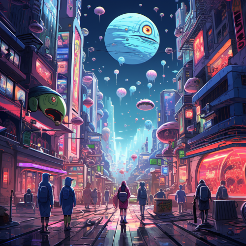 An alien planet with sophisticated one eyed buisness aliens walking in a busseling downtown alien city - anime vibe, bright colors, happy