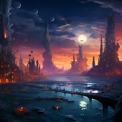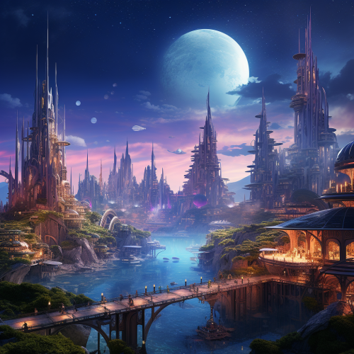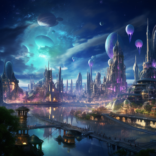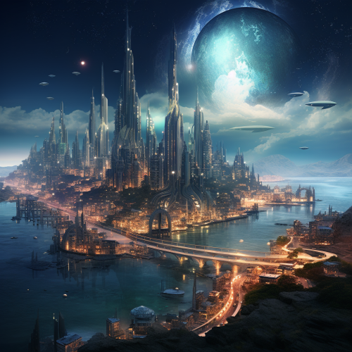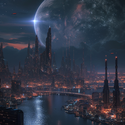 landscape of a city at night. It is situated on a faraway planet. HD Ultrarealistic --v 6.0