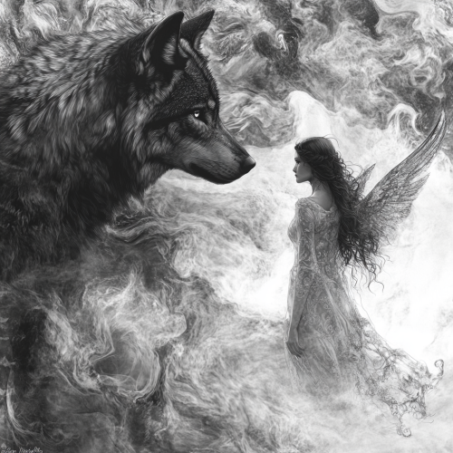 black and white fantasy drawing, stoic wolf staring at you, super imposed with a beautiful female angel standing with her back to you, surrounded by abstract mystical smoke